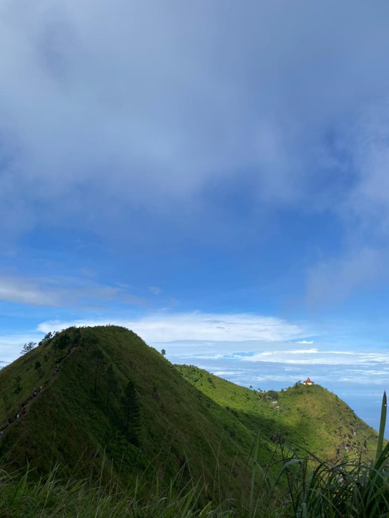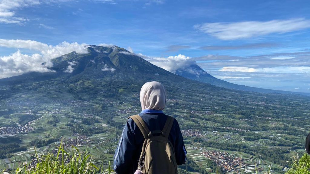 Sampainya di puncak, kabut cukup tebal sehingga pemandangan sempat tertutup. Tapi momen itu justru terasa hangat. Kami foto bersama, bercanda, dan menikmati apa pun yang diberikan cuaca hari itu. Beberapa saat kemudian, kabut mulai menipis dan Gunung Merbabu muncul perlahan dari balik tirai putih pemandangan yang sederhana, tapi memuaskan.